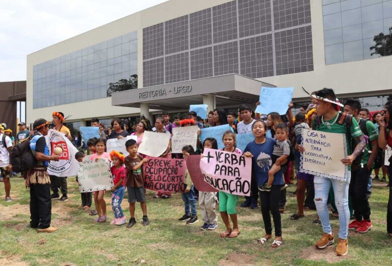 Dezenas de manifestantes se concentram na manhã desta terça-feira (30/9) em frente a nova Reitoria da UFGD (Universidade Federal da Grande Dourados), onde o ministro da Educação, Camilo Santana, participa do ato de inauguração do prédio, na Cidade Universitária.