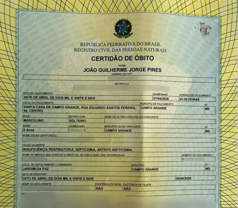 A certidão de óbito de João Guilherme Jorge Pires, de 9 anos, aponta que a morte do menino, ocorrida na madrugada de terça-feira (7), em Campo Grande, foi causada por uma infecção generalizada associada a complicações respiratórias. O documento indica como causas a insuficiência respiratória, a septicemia, infecção disseminada pelo organismo, e a artrite séptica, que atinge as articulações.
